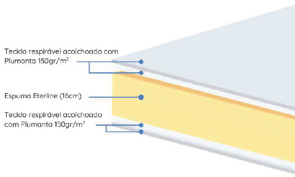 Com um tecido altamente respirável, este colchão garante a eliminação de qualquer tipo de humidade após cada utilização. Pelas suas características o tecido permite uma melhor circulação do ar no interior do colchão, prevenindo o aparecimento de maus odores. O núcleo em espuma poliéster (Eterline 16 cm), garante independência e silêncio no movimento, bem com um bloco indeformável.
