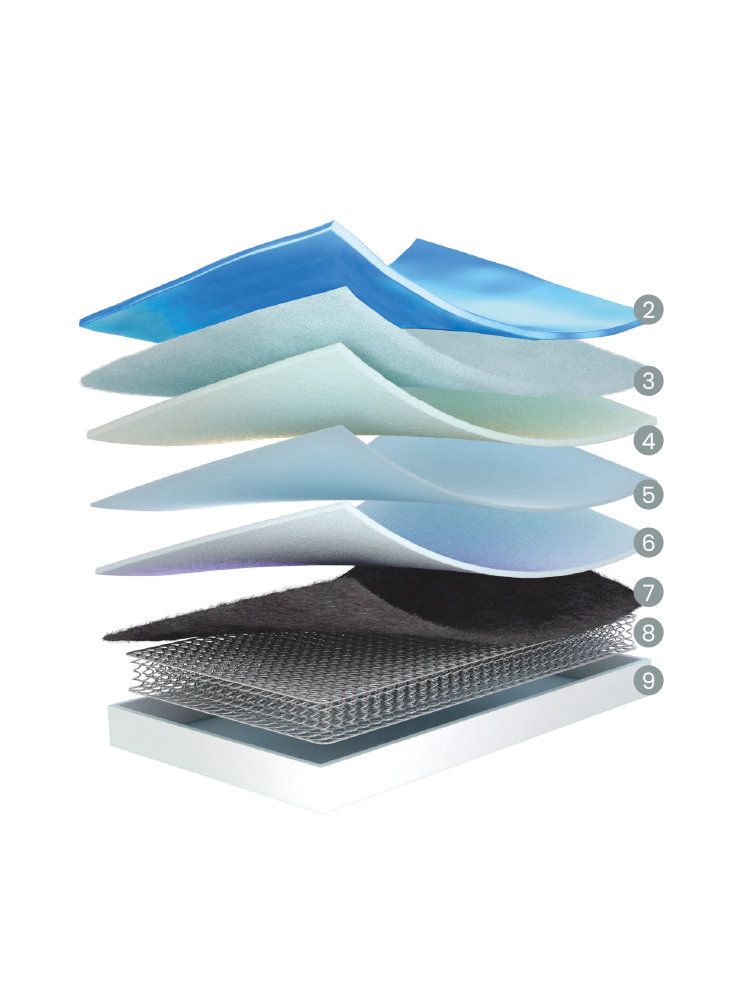 O acabamento Contínuo desenhado para se adaptar de forma eficaz ao bloco interior do colchão promove uma sensação de conforto desde o primeiro contacto. A incorporação de Viscoelástica com uma estrutura de células abertas permite a adaptação precisa ao corpo, que cede apenas nos pontos de pressão, ao mesmo tempo que mantém uma temperatura estável graças à autoventilação.