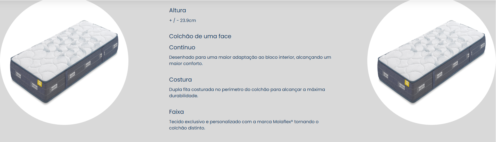 Tecnologia exclusiva Molaflex®. Estrutura compacta de molas duplas de fio contínuo com forma de espiral cruzada que garantem um desempenho ótima na adaptação.