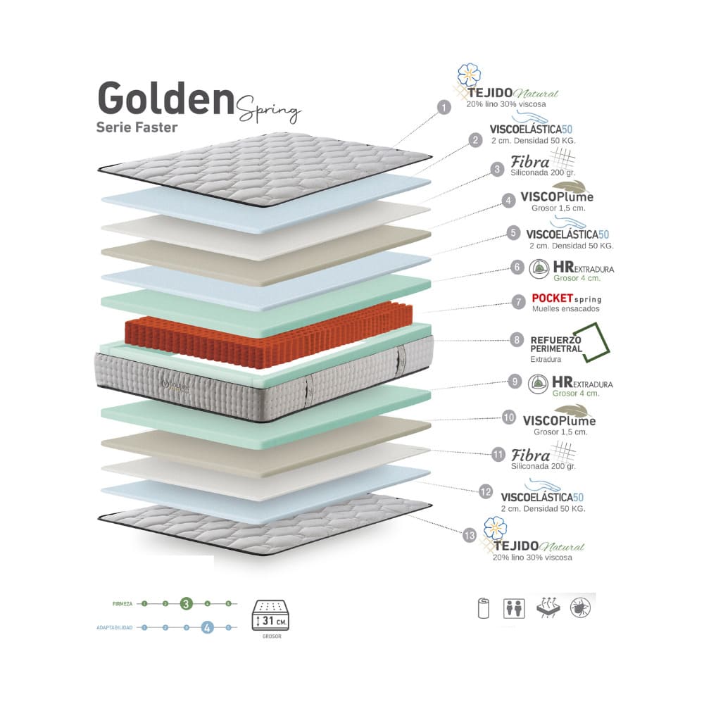 O colchão Golden foi projetado para quem valoriza conforto e materiais naturais. Confeccionado com um tecido exclusivo de linho e viscose naturais, oferece um toque fresco, macio e elegante, ideal para um sono reparador. Seu núcleo de molas ensacadas com reforço perimetral HR extra firme proporciona suporte firme e consistente, enquanto camadas de espuma viscoelástica de densidades variadas garantem adaptação progressiva a cada parte do corpo. Tudo isso se traduz em perfeito isolamento de movimento, ideal para casais dormirem tranquilamente sem sentir os movimentos um do outro. Com 31 cm de espessura e design reversível para uso em ambos os lados, o Golden foi projetado para oferecer durabilidade, equilíbrio térmico e bem-estar noite após noite. VICKFLEX GOLDEN